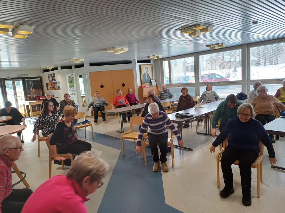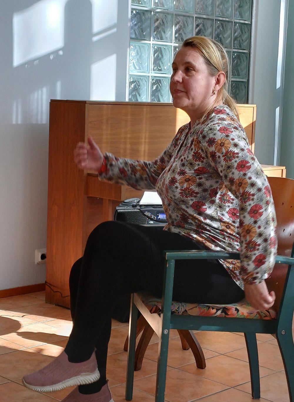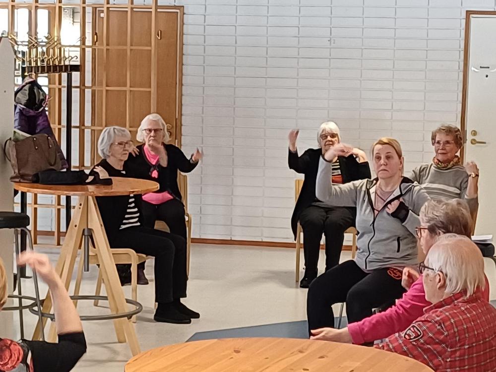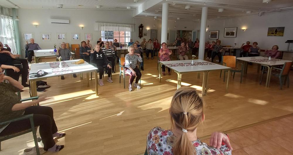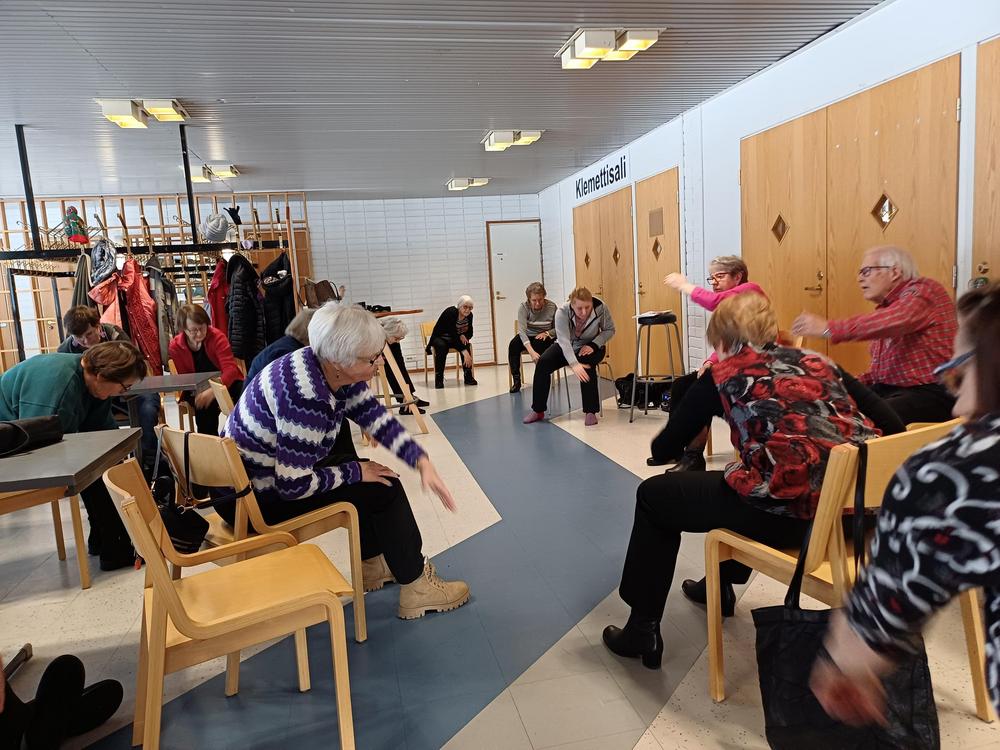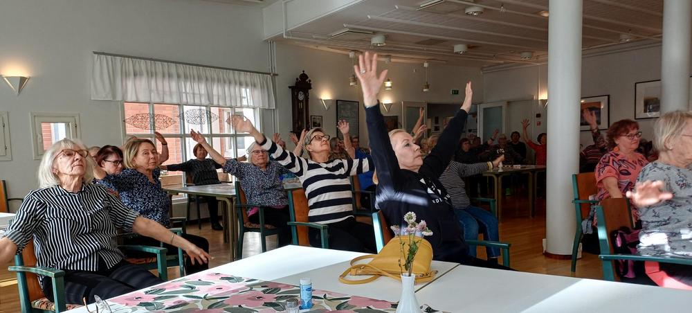 Tarja Ojala piti reippaan tuolijumppatuokion reilulle neljällekymmenelle osallistujalle.