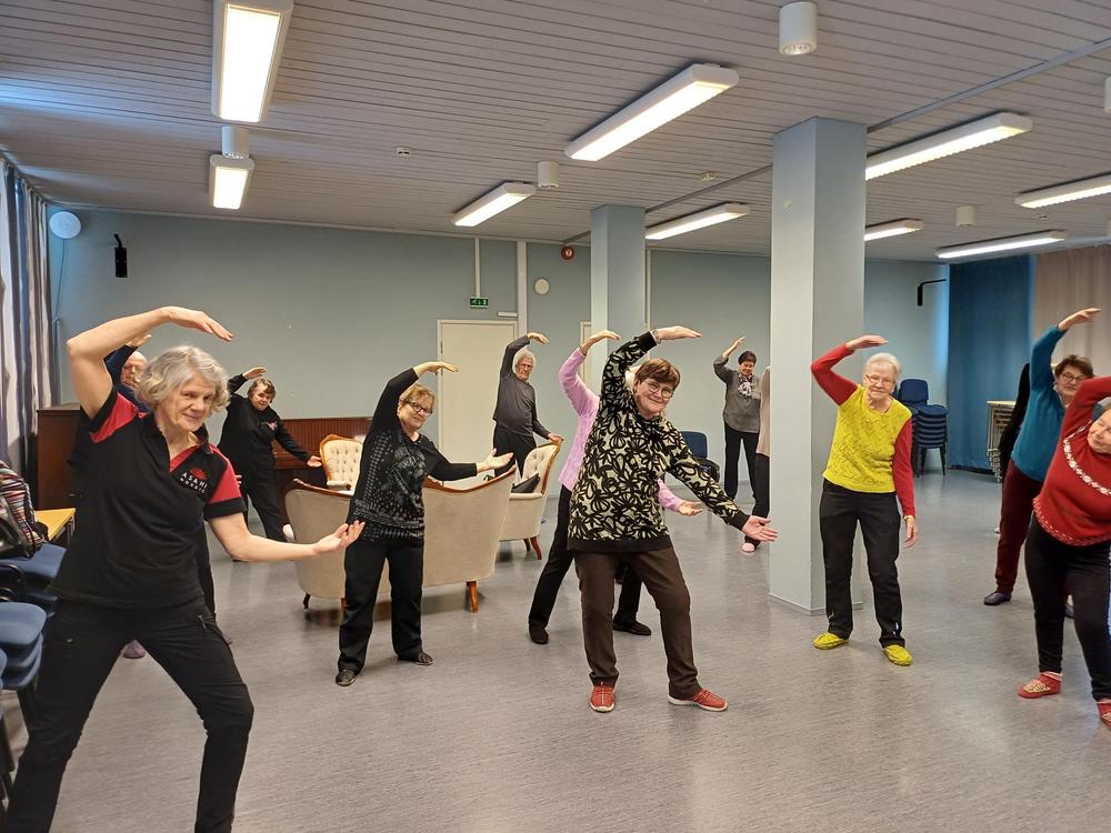 Kahvituksen, rupattelun ja puheenjohtajan tiedotustilaisuuden jälkeen, piti Tarja Ojala osanottajille piristävän tuolijumpan.