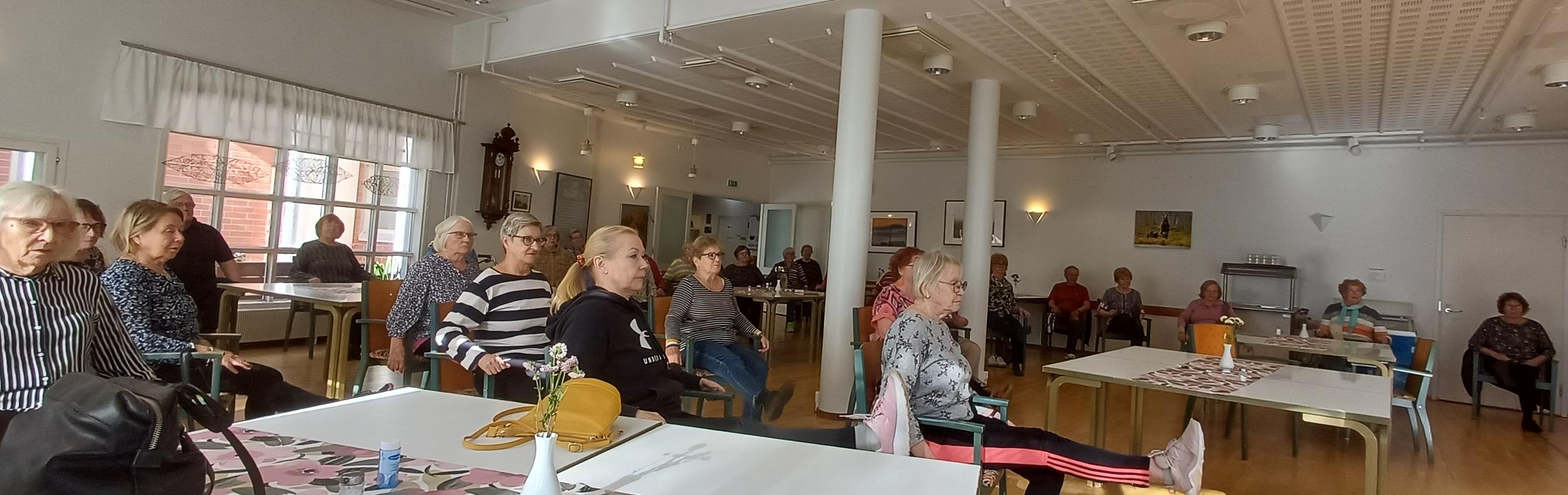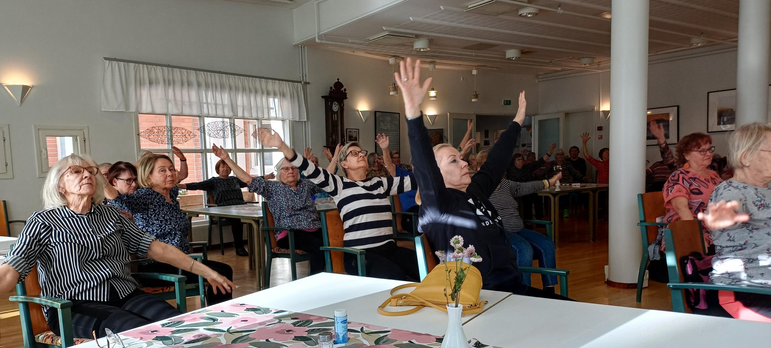 Tarja Ojala piti reippaan tuolijumppatuokion reilulle neljällekymmenelle osallistujalle.