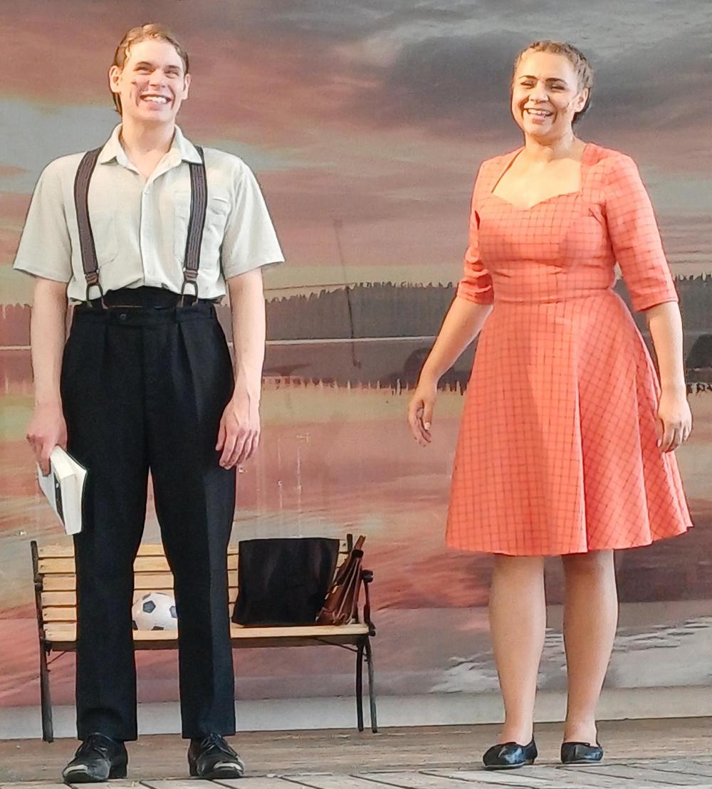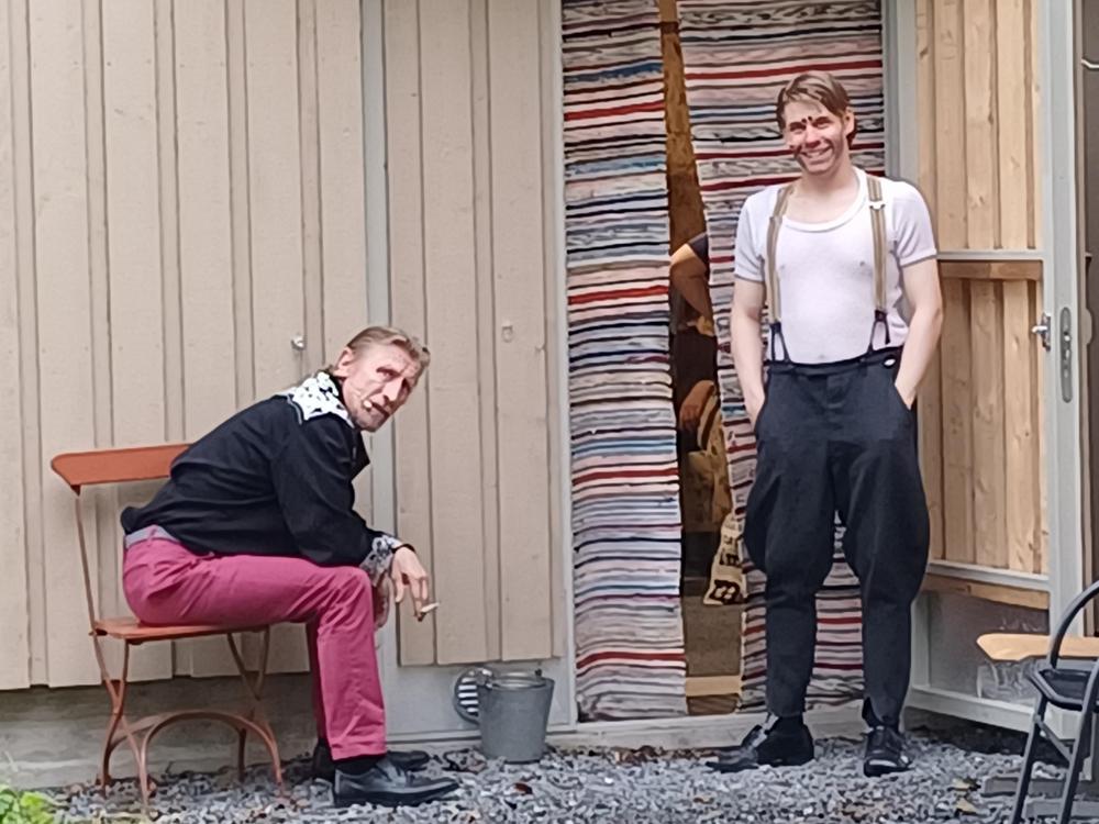 Väliajalla pääsivät näyttelijät hieman huilahtamaan hellelämmössä. Kuvassa vanhempi Vesku - Ilkka Koivula ja Nuori Vesku - Rasmus Koskinen.