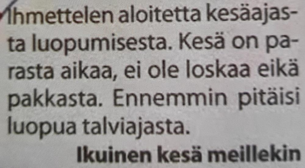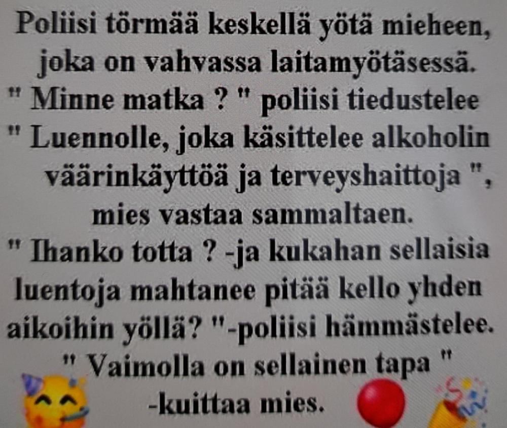 Matti ja Teppo olivat taas matkalle Kanarialle. Istuskeltiin Helsingin lentoasemalla. Voi harmi, ku ei tullu piano mukkaa, sanoi Teppo. Piano? ihmetteli Matti. Eihä me nyt mittä piano voida mukan kuljettaa. Kui sull semmonen tuli miälee? No en mää muuten mittä, mutt ku meijän lentoliput on koton pianon pääl...